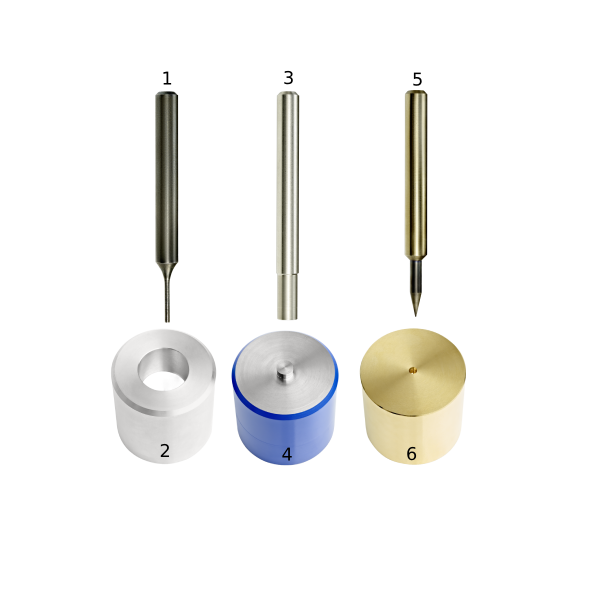 • (5) Formspitze zum Sichern des Schaltknopfes mit (6) Pressunterlage