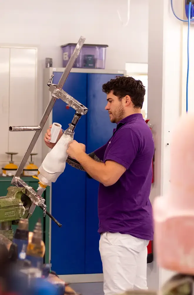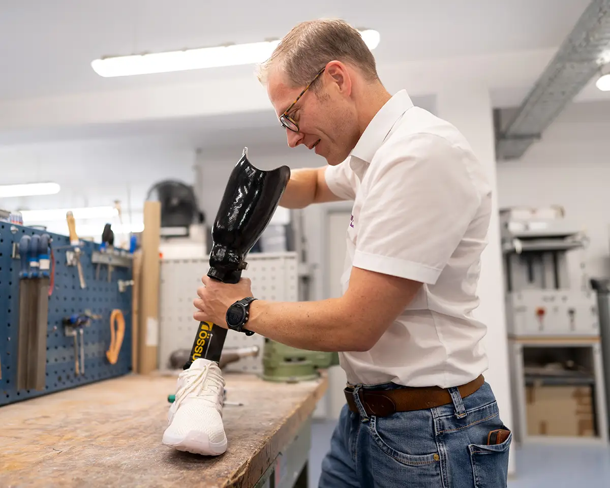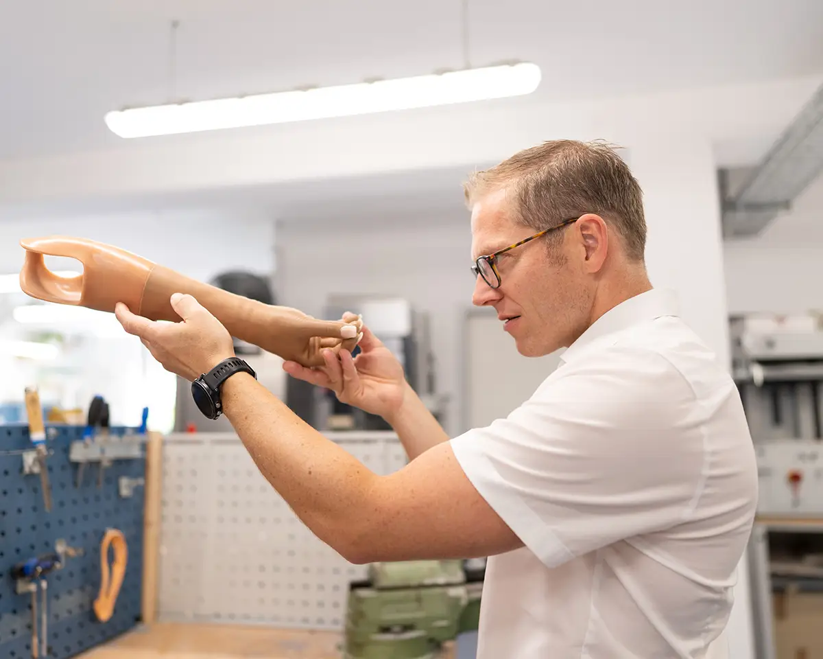 Nach rund sechs Monaten fertigen wir Ihre endgültige Prothese an, bei der das Augenmerk auf ein geringes Gewicht, Funktionalität und auf die Kosmetik gelegt wird. Der Schaft aus Kohlefaser ist sehr filigran und leicht, aber dennoch viermal stabiler als Stahl. Einzelne Passteile stimmen wir individuell auf Ihre Bedürfnisse und Wünsche ab. Mithilfe digitaler Bilder und einer Formerfassung Ihres anderen Beines bzw. Armes fertigen wir eine kosmetische Verkleidung der Prothese, um ein möglichst natürliches Erscheinungsbild zu gewährleisten.