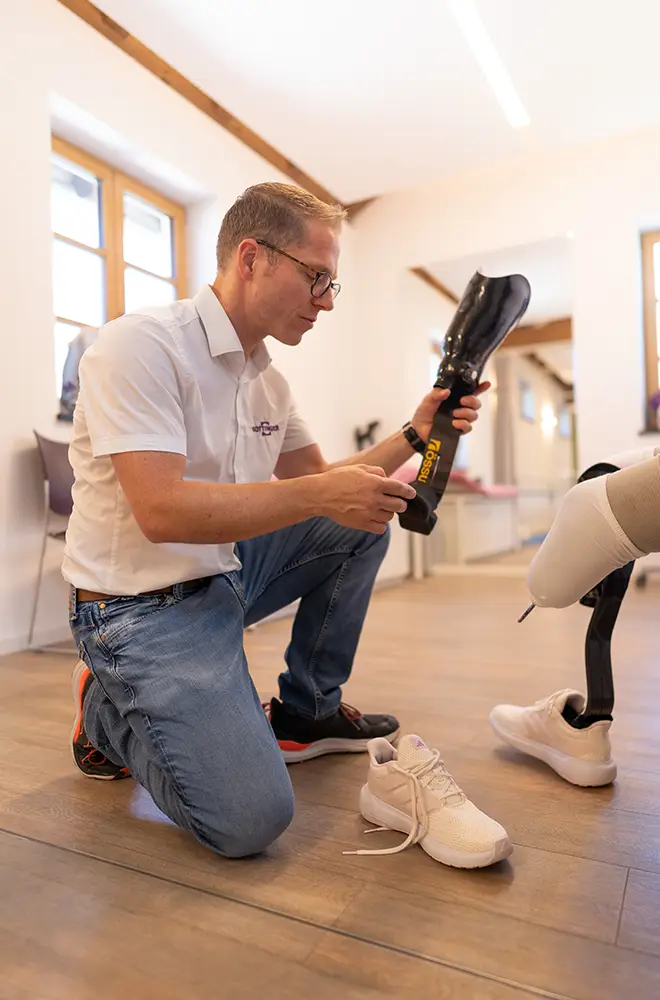 Sobald der Stumpf belastbar ist, beginnen wir mit der Anfertigung einer Interimsprothese. Schon wenige Tage nach der Abdrucknahme können Sie Ihre vorläufige Prothese anprobieren. Während Sie erste Erfahrungen mit Ihrer Prothese machen, gewöhnt sich Ihr Bein bzw. Arm an die Belastung und die Schwellung geht zurück. Die Prothese ist daher darauf ausgelegt, relativ einfach an das sich ändernde Volumen angepasst zu werden. Auch einzelne Passteile wie Schaft, Gelenke und Fuß bzw. Hand lassen sich unkompliziert austauschen. So finden Sie heraus, womit Sie sich am wohlsten fühlen.